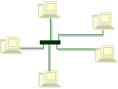 A topologia em estrela utiliza um nó central (comutador ou switch) para chavear e gerenciar a comunicação entre as estações. É esta unidade central que vai determinar a velocidade de transmissão, como também converter sinais transmitidos por protocolos diferentes. Neste tipo de topologia é comum acontecer o overhead localizado, já que uma máquina é acionada por vez, simulando um ponto-a-ponto.